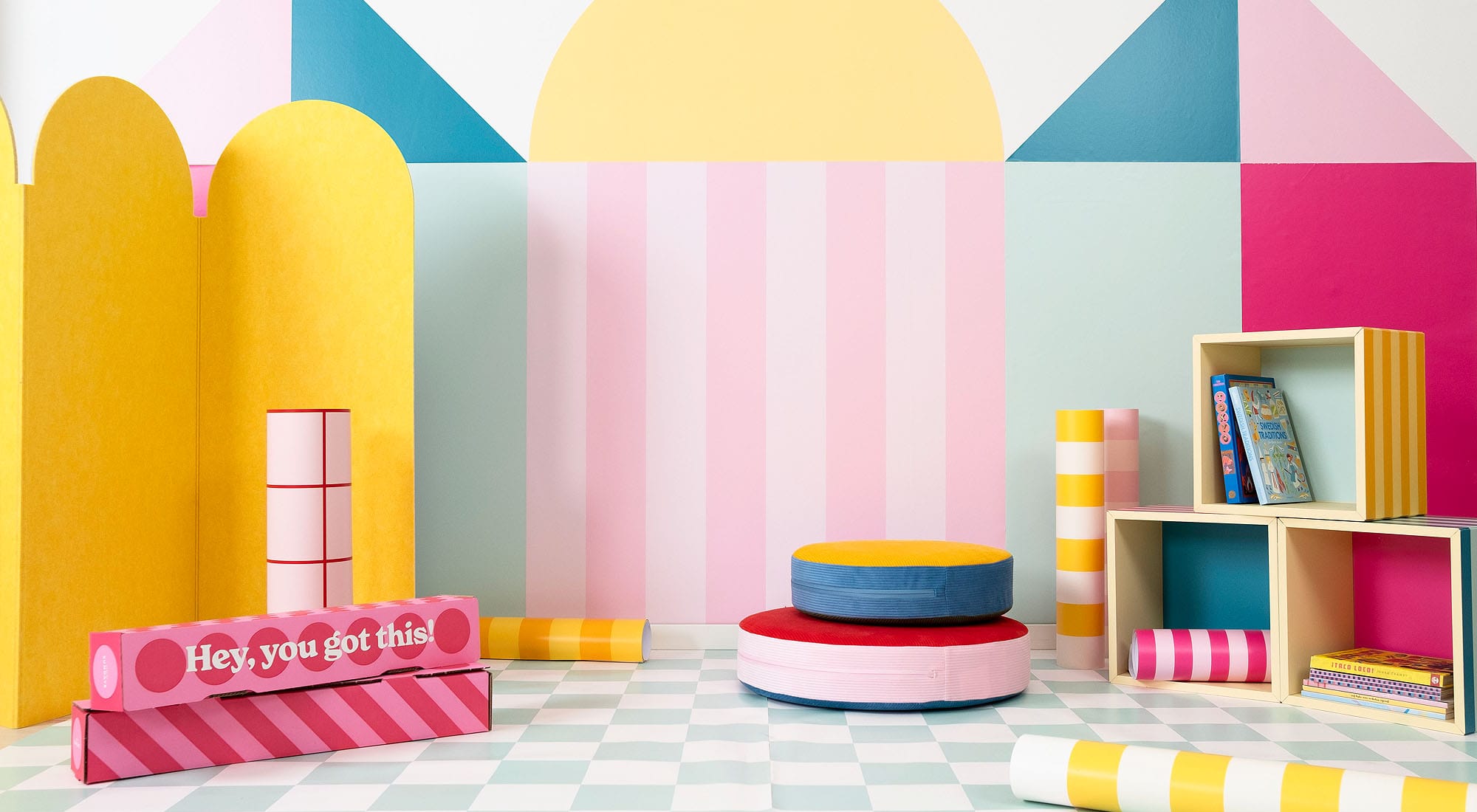 Combine with wallpaper or use them as colorful details around the house.