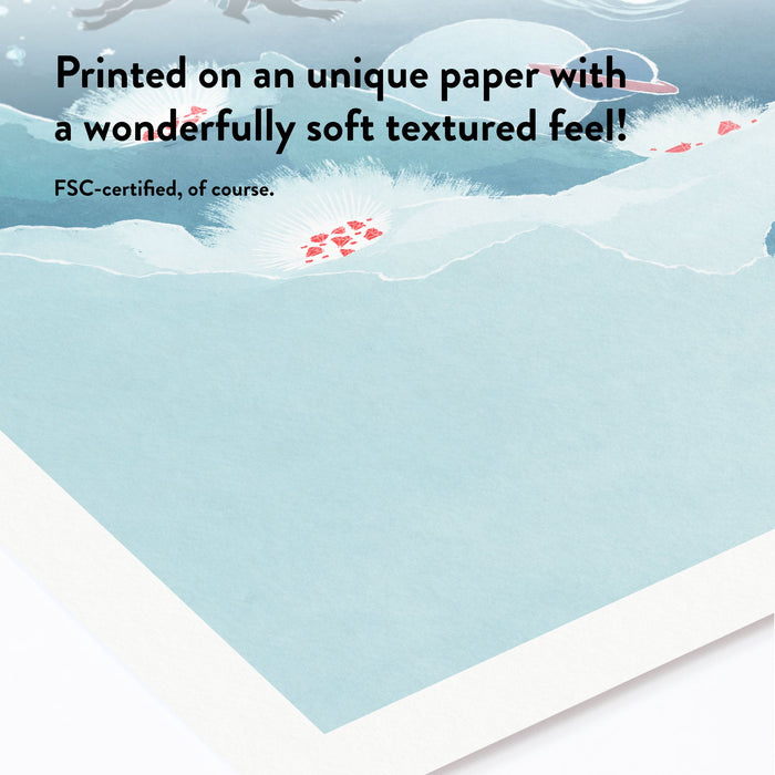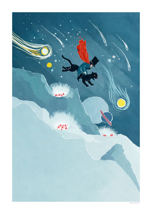 The Magician is on the move and about to arrive to Moominvalley. Familiar from Moomin and the Magicians hat, the mysterious but ultimately friendly magician is riding his black Panther across the night sky. This beautifully painted poster with its cool blue hues go great together with many different interiors.