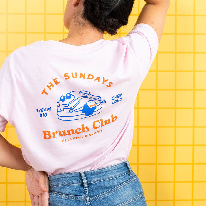 Dream Big, Chew Loud! The Sundays Brunch Club tee is made from super soft lightweight 100% organic cotton in a classic gender-neutral shape, featuring a unique doodle design created by our CEO Alba, depicting herself in her ideal brunch scenario—nestled between two fluffy pancakes!