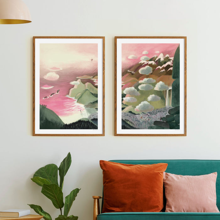 A top view over the magnificent Moominvalley, complete with sea monsters and ships. This pack contains two separate posters which you can attach side by side for a full view of the Valley. The beautifully painted posters with their dramatic green and red hues go great together with many different interiors.