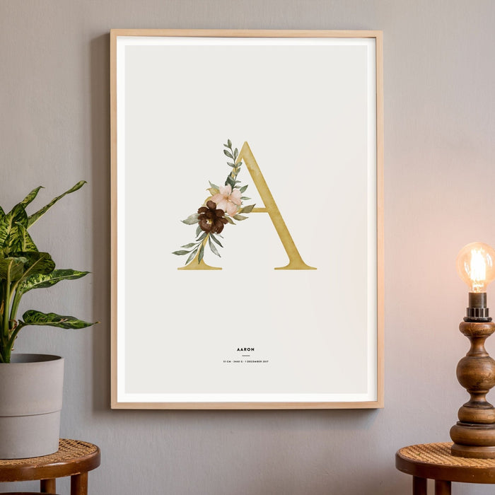 Anna lahjaksi tai juhlista lapsesi syntymää ihanalla syntymäjulisteella. Voit myös käyttää julistetta pelkkänä nimijulisteena jos haluat jättää syntymätiedot pois. Tyylikäs vesivärillä maalattu kirjain harmaalla taustalla sopii monenlaiseen sisustukseen, ja käsin piirretyt kukat tuovat kokonaisuuden eloon.